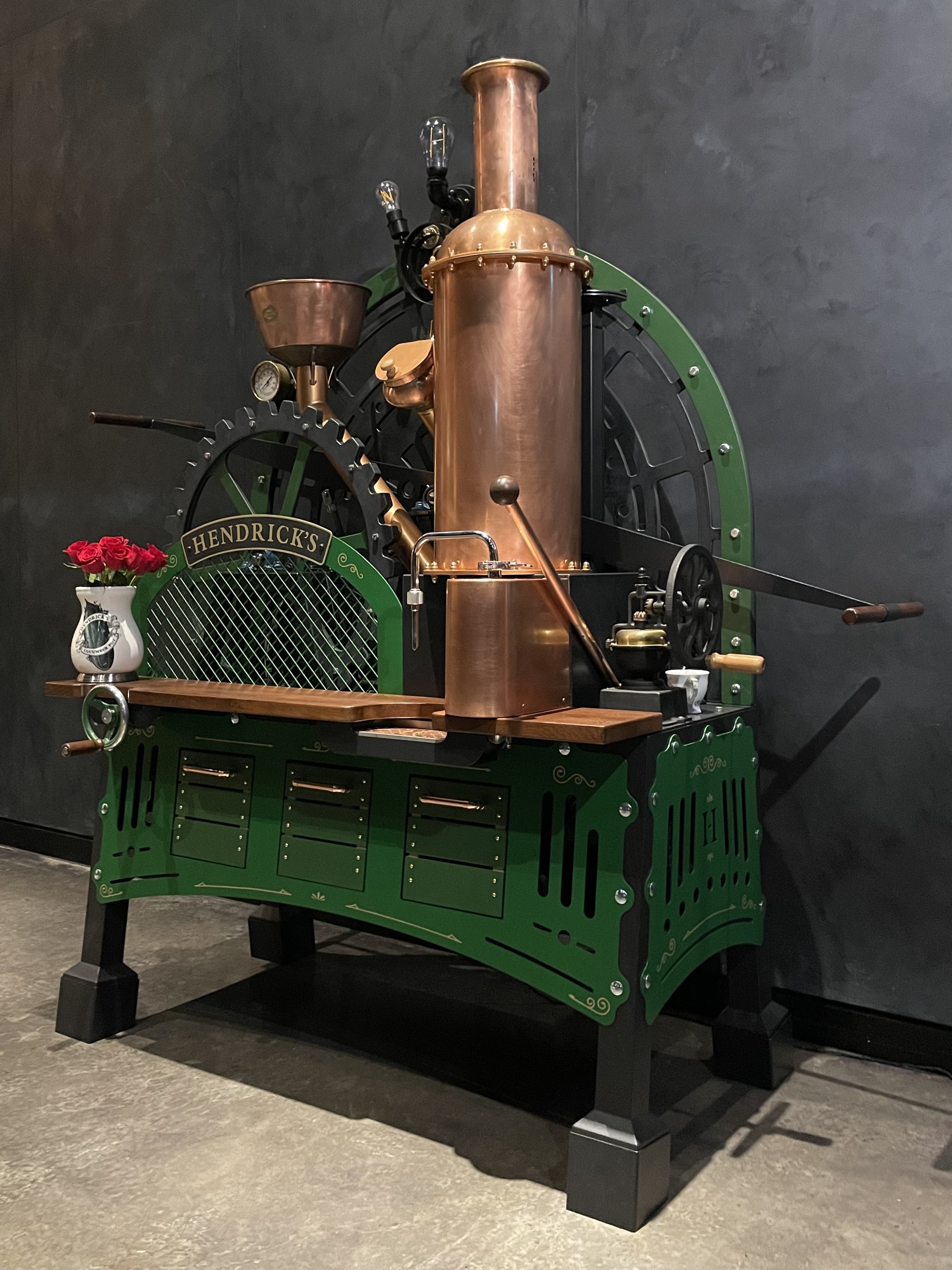 Just as beautiful, magical and eccentric as I dared to imagine, the palace is a homage to all things Hendrick’s and its steampunk Victoriana style. Graced by a lush hothouse on either side, the main atrium is dominated by three imposing brick archways behind which sit three stunning stills – the towering 1948 Carter-Head, the 1860 Bennett (both bought by Charles Gordon in 1966) and a replica of the Bennett made in 2015 – and is home to a plethora of memorabilia and objet d’art as well as a very friendly tortoise!
